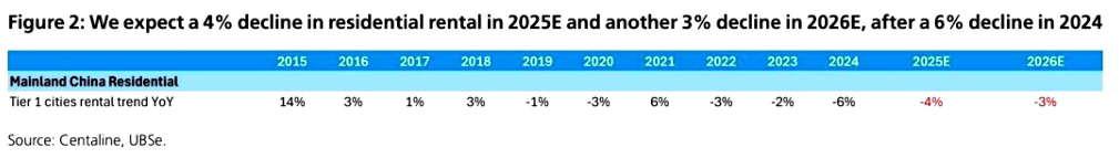 根据中原租赁指数,2025年9月一线城市的租金仍同比下降3%,这表明租赁供应仍在增加,我们将其归因于公共租赁住房供应以及二手房转租市场增加。预计在2026年,由于就业率降低以及租赁房源和公共租赁住房的供应压力,租金价格将再次下降3%。