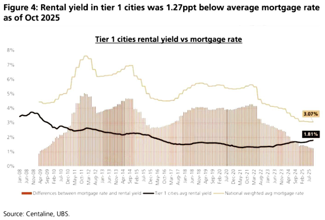 截至2025年10月,一线城市的平均租金收益率提高至1.81%,而2024年10月为1.69%,租售比变高的原因是房价下降。同时由于降息,全国加权平均按揭利率降至3.07%,然而一线城市的租金收益率仍然比平均按揭利率低1.27%。