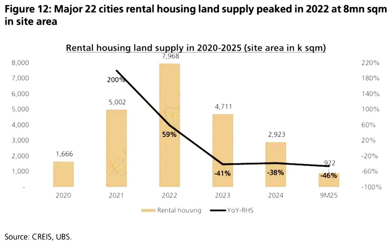 我们看到,社会保障租赁住房的供应已经蚕食了私人住宅租赁的需求,因为社会保障住房在相同的地理位置和设施条件下,价格低于私人住房。社会保障租赁住房首次在2021年的十四五规划中被提及,相应的土地供应在2022年加快。对于22个主要城市来说,社会保障租赁住房的土地供应在2022年达到顶峰,地块面积为800万平方米,而在2025年前九个月土地供应缩减至90万平方米(见图12)。