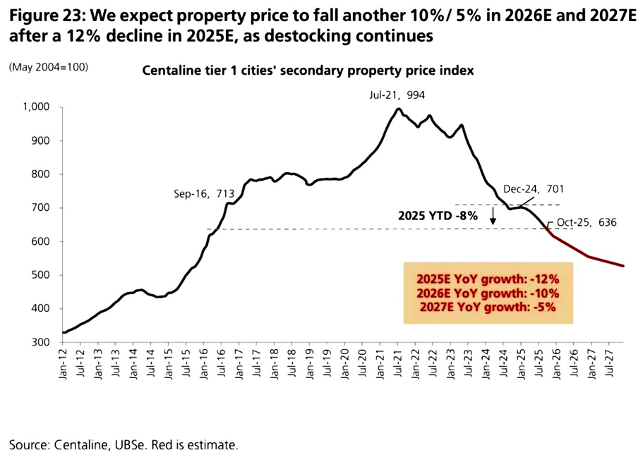 分析:瑞银预测明年房价再跌10%,后年房价再跌5%,然后进入到企稳区间。这个预测基本也是大多数外资的预测,2027年是个关键的节点。