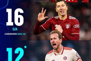 据媒体统计,凯恩本赛季欧冠参与12粒进球,拜仁队史单赛季欧冠参与进球数量仅次于莱万,莱万19-20赛季参与20球、21-22赛季参与16球。